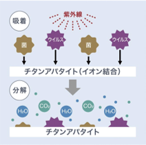「絹筆洗浄料」の主剤としても使用されている、光(室内の光でも大丈夫)を当てることで、有害物質を水と二酸化炭素に分解する光触媒の機能を持つ洗浄料。
